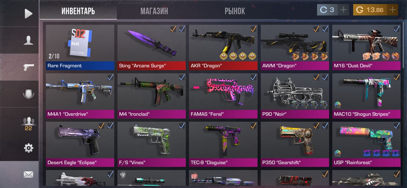 💰Голда: 13.54; 🔪Ножи: 1; ⭐️Редкие скины: 7